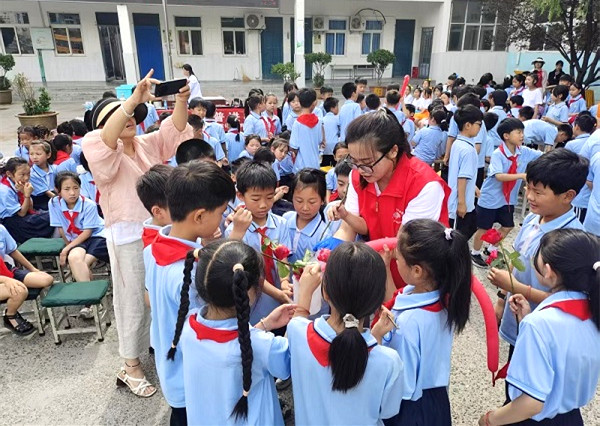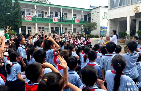 在宜阳县董王庄镇中心小学进行机器人教育科普活动。在科学专家的操控下,机器人随着音乐欢快舞动,动作流畅,萌态十足,引得同学们笑声、掌声不断。