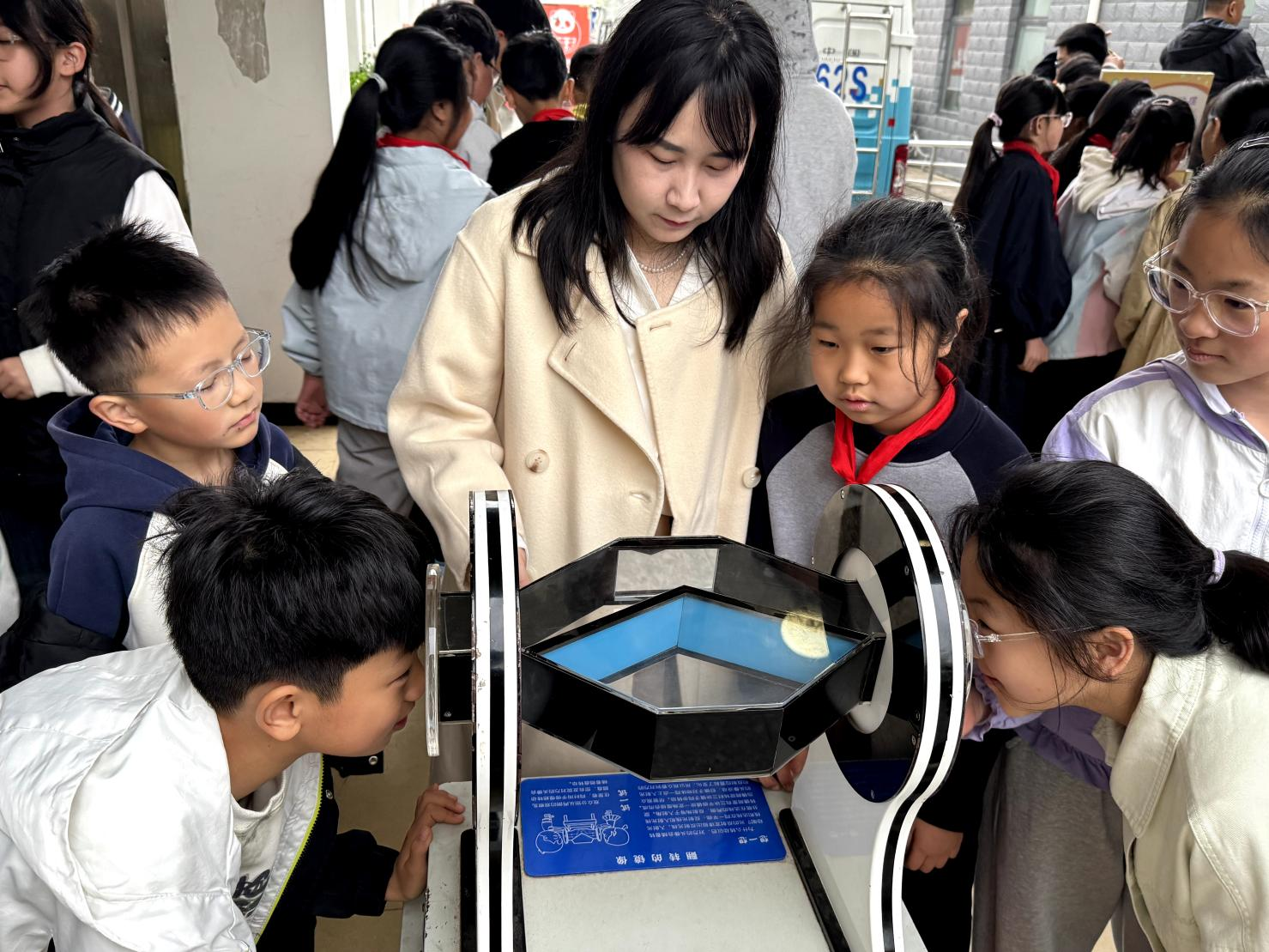 在沉浸式探索环节,每个孩子都被“铿锵锣鼓”“尖端放电”“窥视无穷”等科普大篷车车载展台深深吸引,通过动手探索直观了解声、光、电、磁等领域的科学知识。