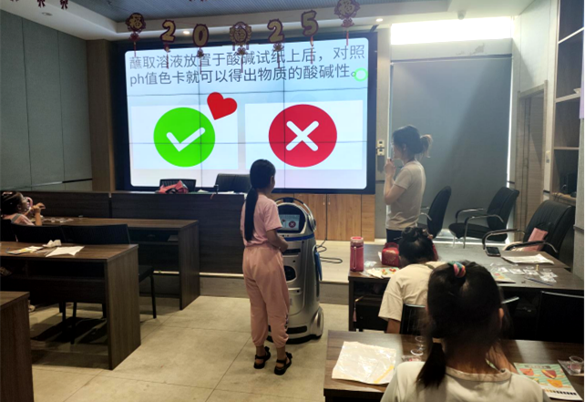 课程中,小朋友们的目光被小胖机器人老师所吸引,机器人老师首先向同学们展示了一根神奇的舌头,随后将不同的液体滴上去,舌头的颜色也随之发生变化。在机器人老师的讲解下,同学们了解到,舌头其实是酸碱试纸,而不同的液体酸碱值也不一样,滴在试纸上便会出现不同的颜色。通过一连串的生活举例以及互动问答,机器人老师不断引导同学们进行深度思考,让同学们了解到酸碱值的定义、测试方法以及在不同领域的应用。