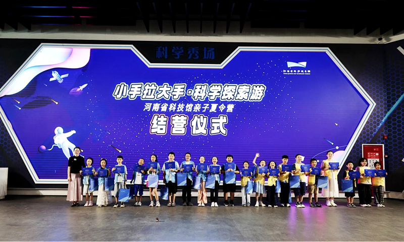 7月27日下午,营员们再次齐聚探索发现展厅科学秀场,举行温馨而隆重的结营仪式。仪式上通过视频回顾夏令营的精彩瞬间,河南省科技馆副馆长李莉为表现优异的小营员们颁发“小小探秘家”和“优秀小小辅导员”荣誉证书,这场充满荣光与温暖的仪式,为本次亲子夏令营画上了圆满的句号。