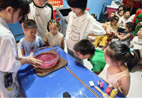 实验一:会跳舞的水花 。“平平无奇”的玻璃盆在贝贝老师手中变身“魔法道具”。当湿润的手掌快速摩擦盆口,加入色素的水面突然跃起晶莹的水珠,像被施了魔法般跳起空中芭蕾。“这就是共振的力量!”贝贝老师解释道——声音的能量通过振动传递给水,才让水花随着节奏舞动。小朋友们瞪大了眼睛,惊叹于这神奇的现象。