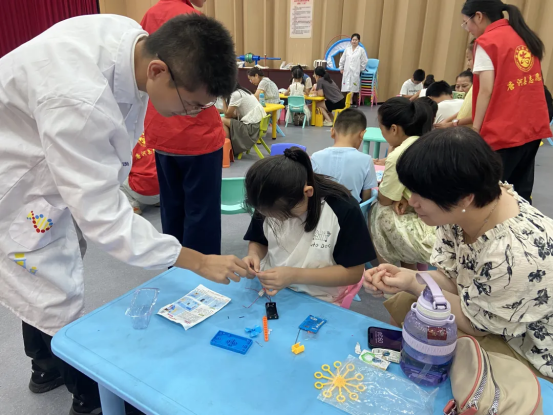 活动还设置了亲子科技小制作——手摇泡泡机环节。科技辅导员讲解了实验器材、制作原理及安装步骤,它将“产生风”“蘸取泡泡水”“形成泡泡”等步骤巧妙地融合在一起。家长与孩子协作对照图纸组装部件、调配泡泡水,当孩子们转动摇柄,看着自制泡泡机吹出缤纷泡泡时,满是自豪与喜悦。亲子协作不仅增进感情,更锻炼了孩子们的动手与创新能力。