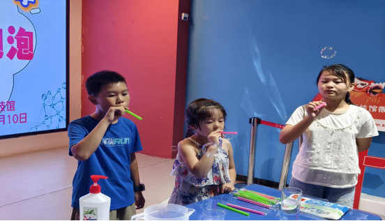 实验环节中,小朋友们亲自动手尝试用手套接泡泡、抛泡泡,发现泡泡竟能“跳舞”而不破。老师解释道,洗洁精中的表面活性剂降低了水的表面张力,而白糖和甘油增强了泡泡的韧性,棉手套的疏水性则保护了泡泡膜。孩子们在互动中不仅玩得开心,还学到了科学知识。