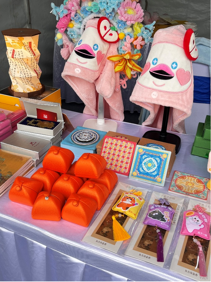 从“开封小笼包毛绒挂件”到“唐三彩抱鸭女佣瓶”,香包、挂件、精美书签应有尽有,作为此次赛事展示河南文化的窗口,河南嵩阳文化策划有限公司带着他们精心设计的文创产品来到颁奖台旁,为国内外游客带来独具匠心的游购体验。