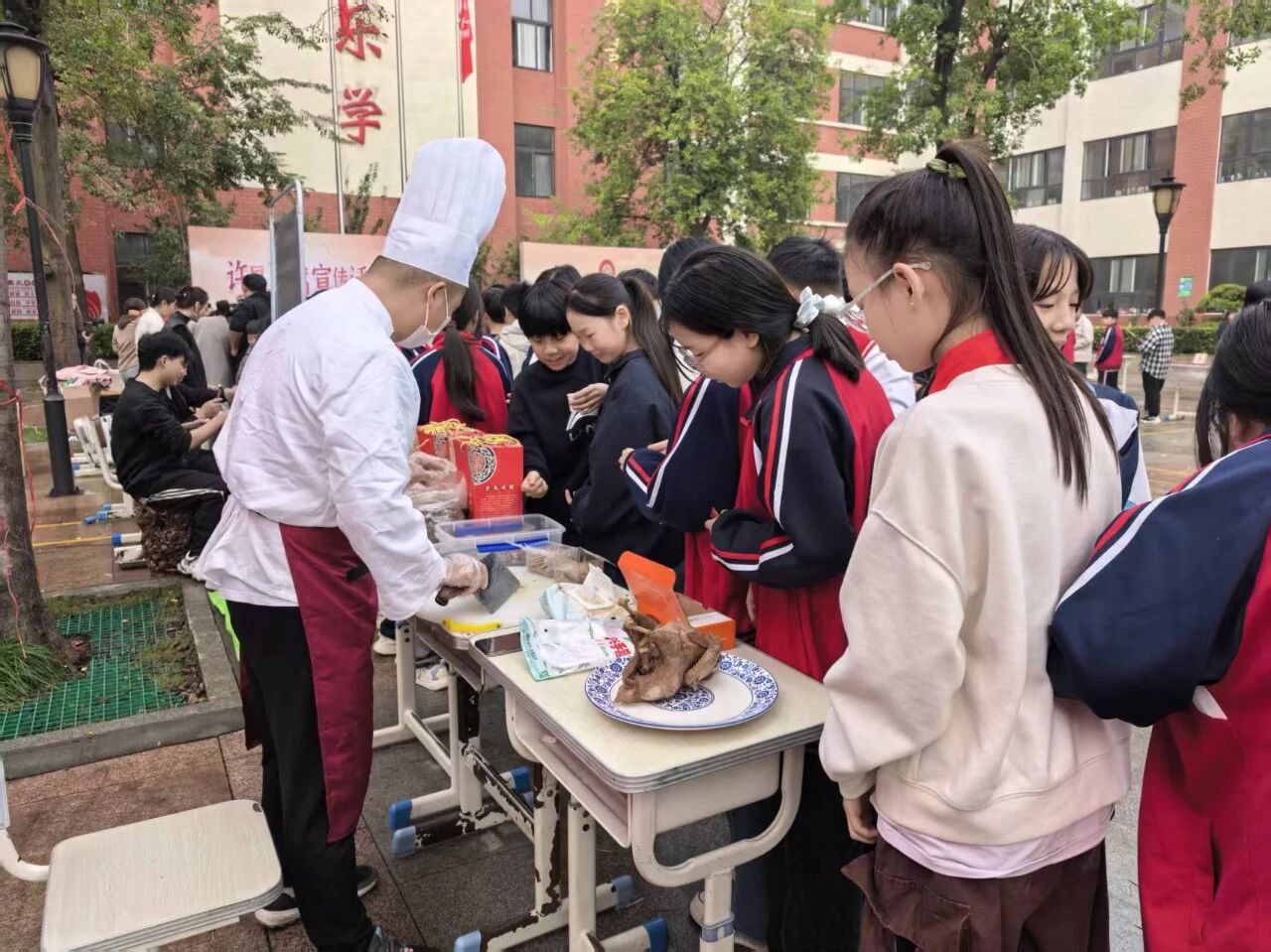 九天阿胶展位更是排起长队,省级非遗传承人赵向阳带来的阿胶样本在灯光下晶莹剔透,断面泛着琥珀光泽。“这是用寒冬‘交九天’的黑驴皮,经72道工序熬制九天九夜而成的。”他指着图文展板讲解,还让学生触摸阿胶块感受“质硬而脆”的特质,“你们看这块阿胶,落地会像冰块一样碎裂,这才是上品。”学生们纷纷惊叹:“原来奶奶吃的阿胶要经过这么多考验!”