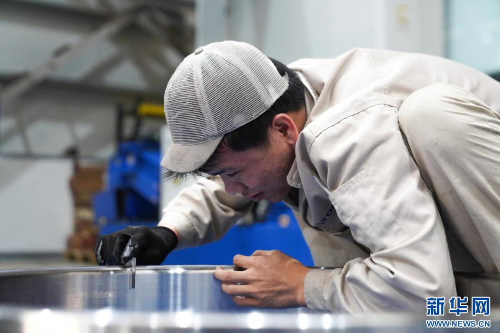 11月3日,工人在位于河南郑州的中铁装备集团车间检测盾构机刀盘。