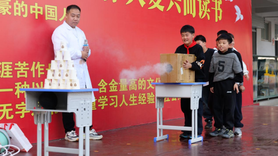 开幕式上,精彩绝伦的无人机表演率先登场,小巧的飞行器在空中灵活穿梭,引得台下学生欢呼雀跃,掌声与惊叹声此起彼伏。紧接着,“钉子气球”“液氮大爆炸”“马德堡半球实验”“空气炮”等科学实验秀轮番登场,让同学们在互动体验中近距离解锁科学的神奇,更直观感受科学原理。