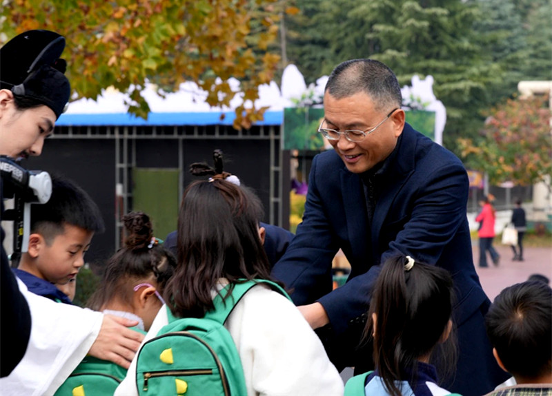 郑州市委网信办主任张永向小朋友赠送传承徽章