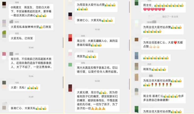 当患者家长群得知周医生捐献造血干细胞时,也纷纷为其点赞。这些温暖的话语,是对他善举最珍贵的肯定与鼓励。