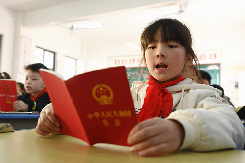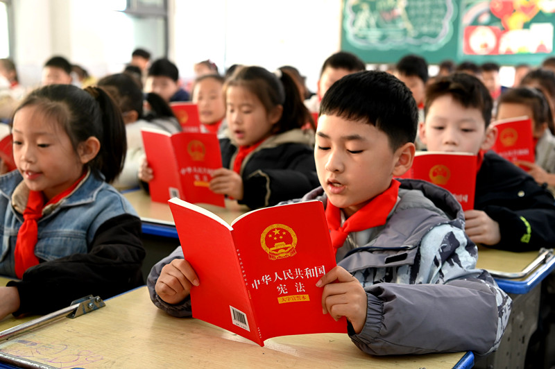 12月4日,河南省沁阳市李商隐小学学生在国家宪法日主题班会上阅读学习《宪法》。