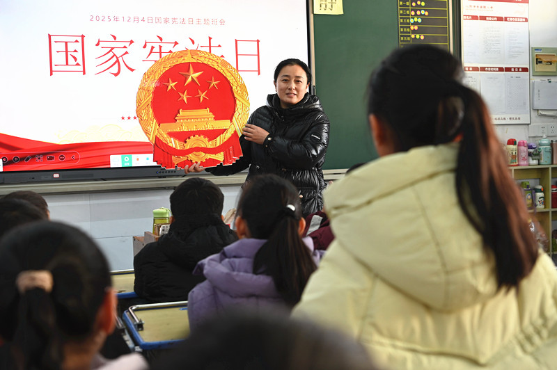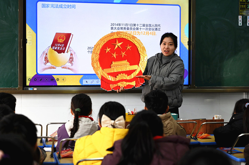 12月4日,河南省沁阳市李商隐小学老师在国家宪法日主题班会上为小学生讲解宪法和国徽知识。