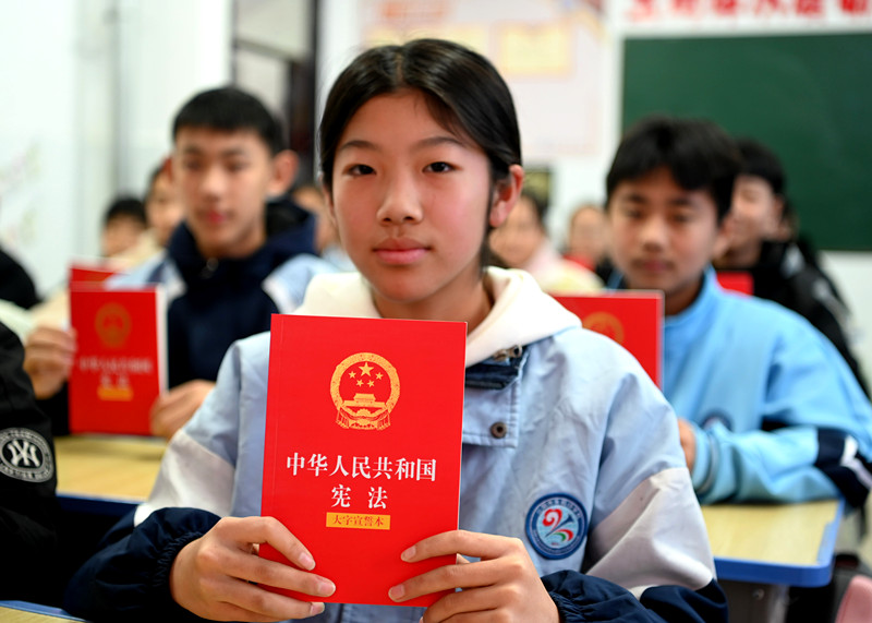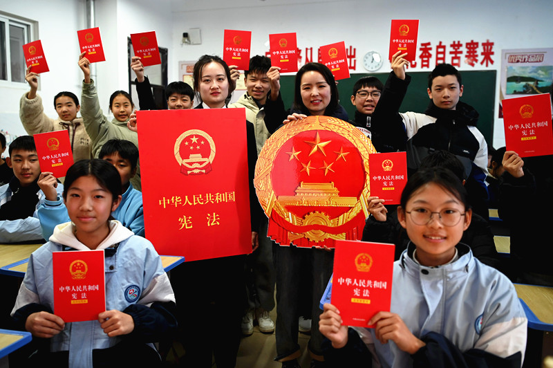 12月3日,在河南省沁阳市朱载堉学校,沁阳市人民法院法官和初一(8)班师生展示《宪法》迎接第十二个国家宪法日。