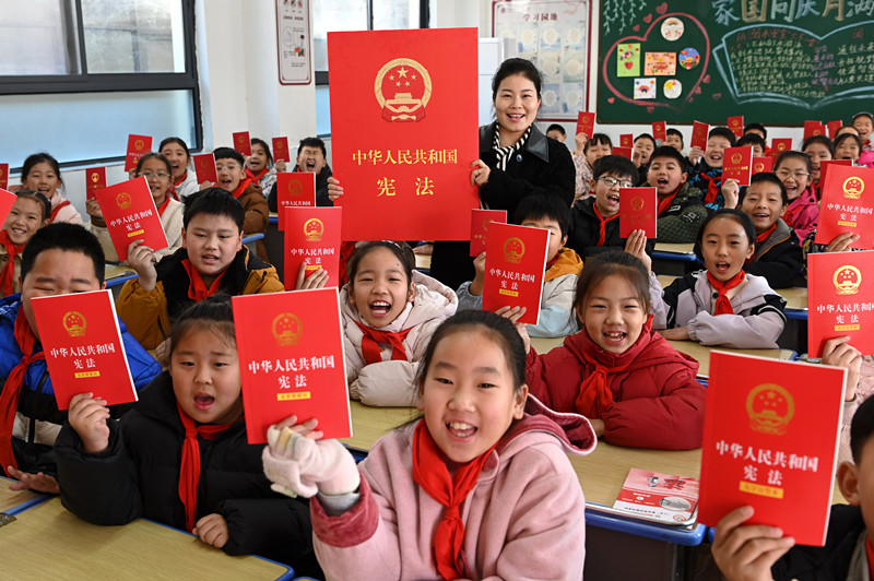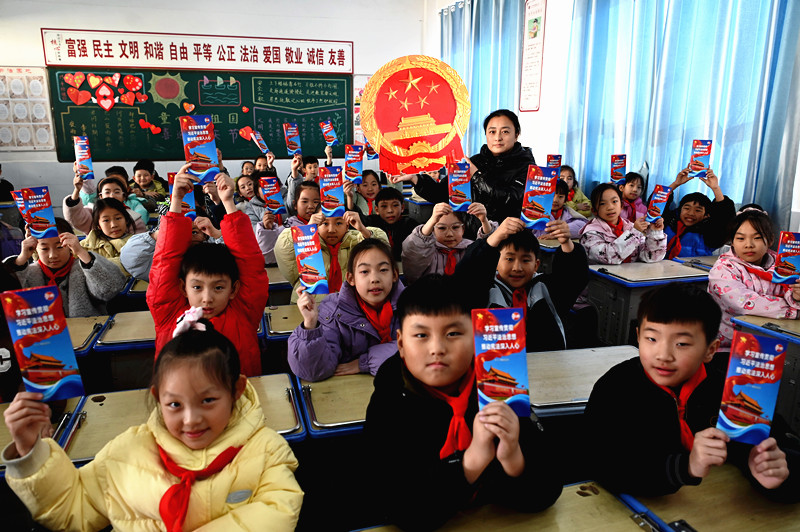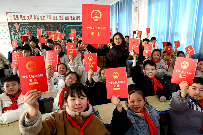 12月4日,河南省沁阳市李商隐小学学生在国家宪法日主题班会上展示领到的《中华人民共和国宪法》。