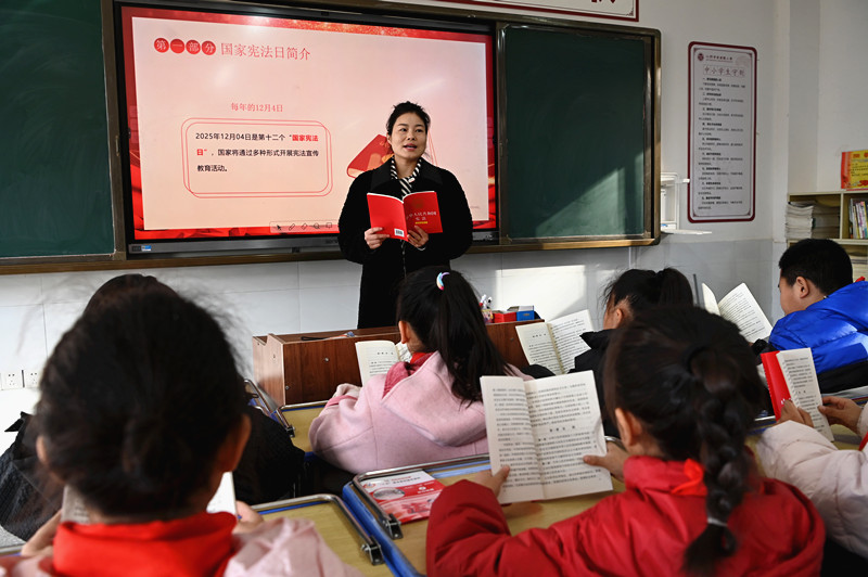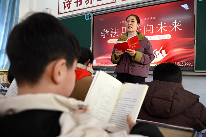 12月4日,河南省沁阳市李商隐小学,老师在国家宪法日主题班会上领着学生阅读学习《宪法》。