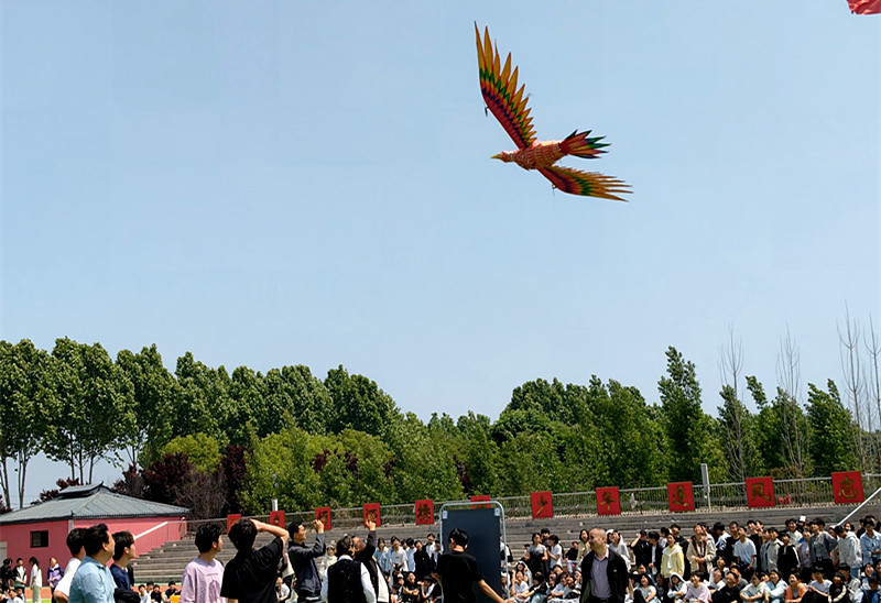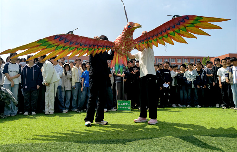 造型精美的飞天凤凰航模震撼升空,在操控人员专业指挥下平稳飞行、优雅盘旋,宛若神鸟翱翔天际,兼具科技感与观赏性,为整场展演增添别样风采,让青少年感受传统美学与现代科技的碰撞融合。