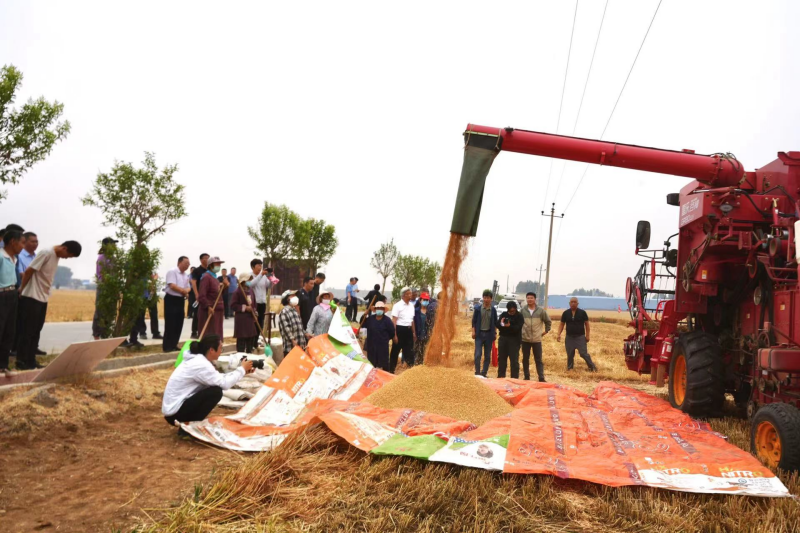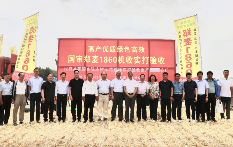 6月2日,河南省科技厅组织中国农科院研究员马有志、河南农业大学教授尹钧、河南省种业发展中心研究员周继泽、河南科技学院教授茹振钢、河南农业大学研究员谢迎新、商丘市农业农村局研究员苏成军等专家成立机收实打测产专家组,对民权县花园乡陈庄对高产优质绿色高效国审郑麦1860进行机收实打验收。随着专家组现场检查完设施,操作手熟练启动收割机,轰鸣声中,收割机快速作业。经专家组现场称重、去杂、水分测试等验收环节后,验收结果为:实收面积5.1亩,籽粒净鲜重4845.2公斤,按照国家粮食入库标准安全含水量13%计算实际亩产为903.1公斤。郑麦1860自2021年在商丘亩产突破800公斤后,再一次刷新商丘小麦高产纪录。亩产突破900公斤,在今年全省的小麦高产攻关中,也是屈指可数的。随后专家组赶到商丘市原种场郑麦1860高产示范方,实打验收亩产为838.5公斤。