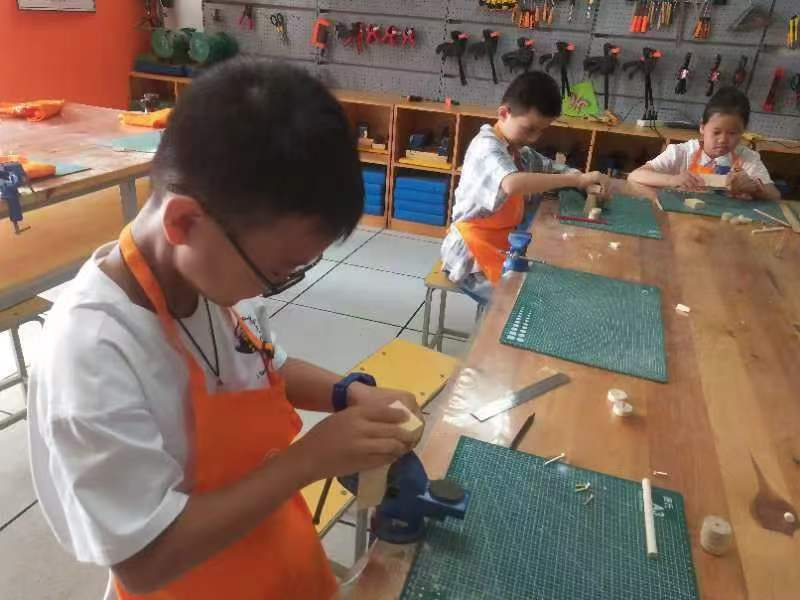 小营员专心制作木艺。