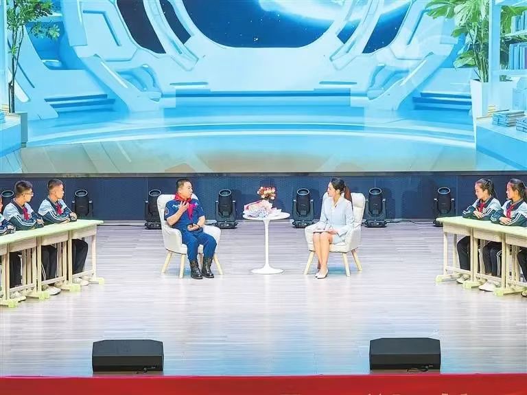 在“与航天英雄面对面”访谈环节,杨利伟结合自身经历讲述了 航天故事,中小学生就太空知识、航天科技等话题踊跃提问,更加深 刻地理解了载人航天精神的内涵,展现了探索未知、追求真理的热情。广大师生、科技辅导员还通过朗诵、科普剧等丰富多彩的形式,向坚持自立自强、为我国航天事业作出卓越贡献的科技工作者致敬。