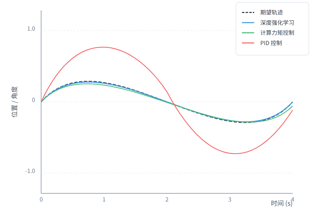 仿真结果表明,基于深度强化学习的控制方法在轨迹跟踪精度、响应速度和鲁棒性方面均优于传统PID控制和计算力矩控制方法。特别是在存在建模误差和外部干扰的情况下,深度强化学习控制器展现出了更强的自适应能力。
