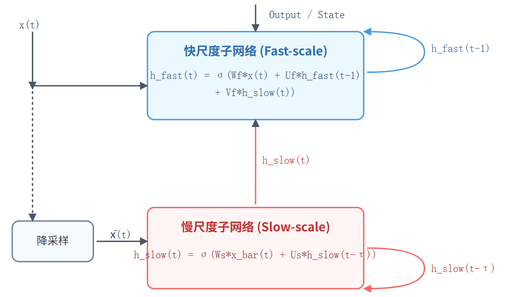 为了处理机电一体化系统的多时间尺度特性,可以采用多尺度递归神经网络结构。该网络包含快尺度子网络和慢尺度子网络,分别负责捕获系统的快速动态和慢速动态: