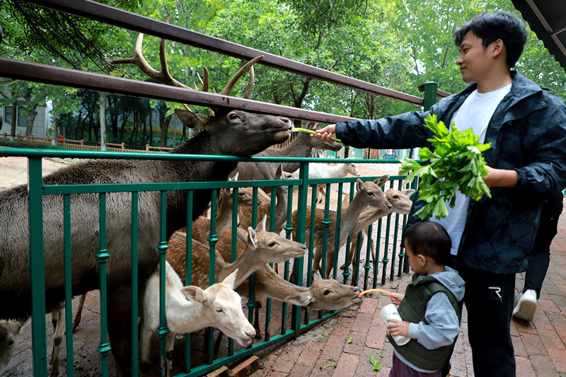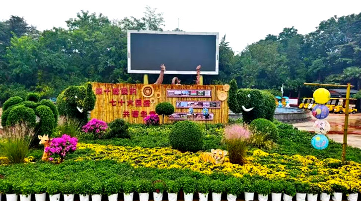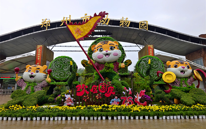 节日期间,郑州市动物园在大门外广场摆放了立体花坛《鼓振菊潮》,花坛主体以憨萌老虎造型为核心,中间的虎擎 “豫” 旗,两侧的虎傍鼓,传递地域特色与欢庆意趣。同时,在大象房、鸟语林、长颈鹿馆还分别摆放了《轮影花漾》《秋颂田园》《帽语菊韵》等花境,在主干道打造了一些微型景观,营造了浓厚的节日氛围。