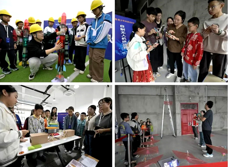 比赛现场精彩纷呈,团队成员分工协作、默契配合。在“气弓箭打靶”项目中,同学们巧妙利用铜板纸制作箭体,精准控制气压完成发射;“铁丝陀螺比久”项目则考验选手的耐心与精细操作,一根根普通铁丝在同学们手中化作旋转不止的陀螺;“纸桥承重”项目中,各组运用有限的纸张构建出承重惊人的桥梁结构,展现了出色的工程思维;“新能源小车竞速”项目环节,同学们自制电池驱动小车在赛道上飞驰,体现了绿色能源的实践应用;“抛石机攻城”项目则融合历史与物理知识,选手们搭建的抛石机精准打击目标,场面激烈有序;“‘鸡蛋’撞地球”项目巧妙考验同学们的缓冲与保护设计,一枚枚脆弱的“鸡蛋”在精心制作的装置中安然承受高空坠落的冲击;“自制无人机挑战赛”项目则融合空气动力学与精准操控,一架架亲手组装的飞行器在选手的指挥下灵活穿越障碍,展现了卓越的动手能力与创新思维;室外项目“水火箭比高”将现场气氛推向高潮,一支支水火箭冲天而起,引来阵阵欢呼。