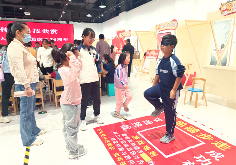 小朋友们跟着科普辅导员学习绘制漆扇,绘京剧脸谱、做花草纸灯;那边,“小小发明家”们忙着用3D打印机制作专属红旗,看着自己设计的图案从数字模型变成实物,成就感直接爆棚。市集旁的 “趣味大挑战” 专区更是笑声不断。“原地踏步走” 考验平衡感,有的小朋友刚蒙上眼就忍不住往旁跑偏,小脚步歪歪扭扭逗得围观者捧腹;投壶、三角棋等传统闯关游戏前更是排起长队,全家老小组队PK,笑声与喝彩声此起彼伏,有人感叹:“原来传统文化和科技脑洞能这么搭。”