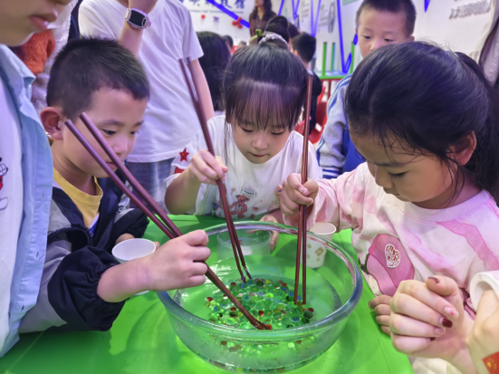 科技互动体验区同样热闹非凡,多项趣味游戏让游客流连忘返。“趣味投壶”保留古代民俗经典玩法,通过投掷箭矢的过程来沉浸式感受古人的娱乐智慧;“海底捞月”游戏既考验手眼协调能力;“指纹识别”互动项目让小朋友们亲手操作指纹采集、比对流程,真正实现“玩中学、学中悟”。此外,“偶遇NPC”互动环节极具特色,游客通过参与互动问答,获取中秋定制科普纪念品,在互动中普及科学知识,传递节日祝福。