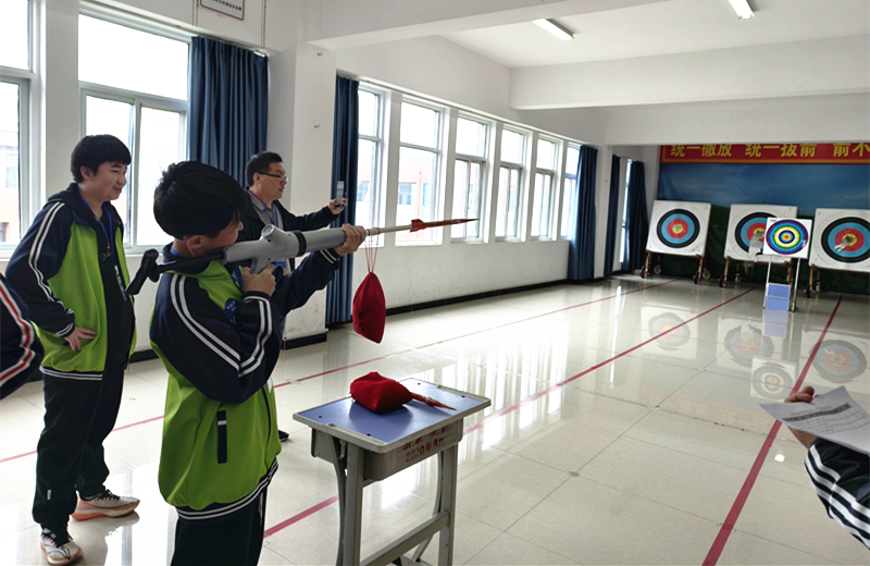 “气弓箭打靶”现场,选手们熟练地调节发射角度和发射气压,弓箭穿透靶心赢得阵阵喝彩。