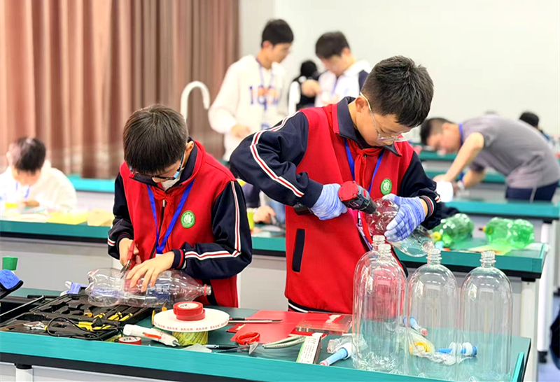 “水火箭比高”区,选手们变废为宝,将废弃的汽水瓶子制作成能够 “一飞冲天” 的水火箭。