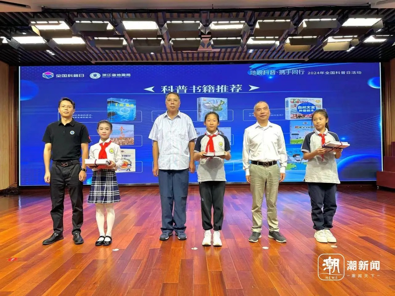 “地震科普 携手同行”为主题的科普活动在杭州市钱塘区新湾小学举行,现场开展赠书环节。图源:潮新闻