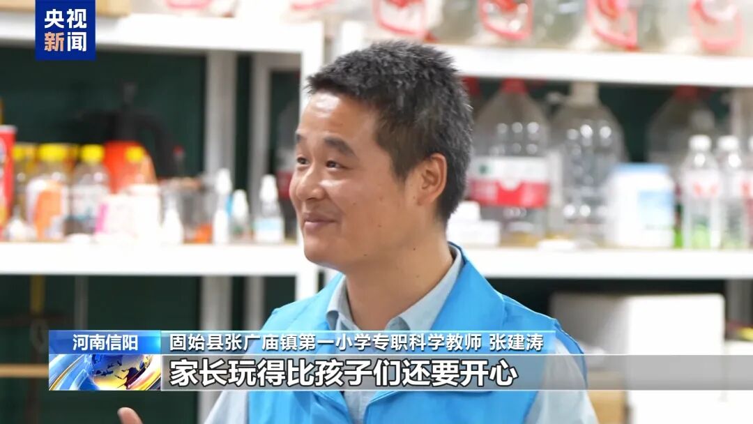 固始县张广庙镇第一小学专职科学教师 张建涛:邀请家长和孩子们一起到学校来体验科学实验,家长玩得比孩子们还要开心。我觉得时代的大氛围,影响到我们每一个人。国家整体重视科学教育的氛围上来了,老师们更重视了,孩子们更重视了,家长们也更重视了。