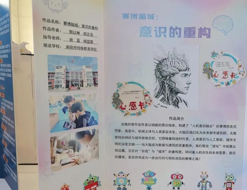 上百件优秀作品中,一幅名为《赛博脑城:意识的重构》的黑白绘画作品十分引人注目。画作旁边,两位小作者飞快打着手语,在带队老师帮助下向参观者讲解他们的创作思路。
