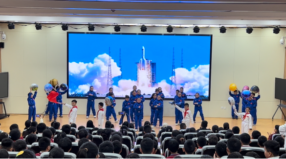 科技节开场第一段 “童眼看星河 科技探宇宙” 主题舞蹈瞬间点燃全场热情。小舞者们身着蓝白相间的航天服,每一个旋转、每一次舒展都充满力量。几位同学脚踩平衡车穿梭全场,车身上搭载的迷你航天模型随之灵动转动,时而模拟火箭升空,时而展现卫星环绕。省科技馆科技志愿者的“液态”趣味实验,让同学们被神奇的物理化学反应深深的震撼。