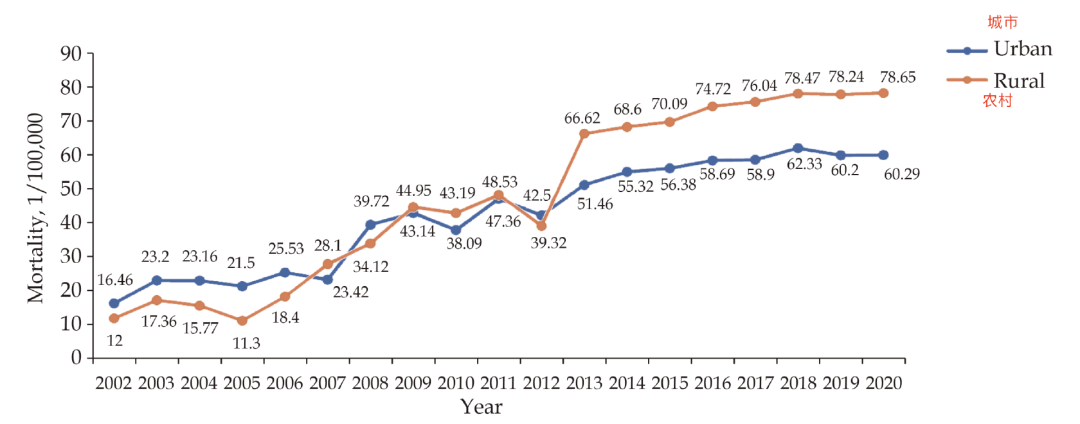 想必大家对心梗都不陌生。心肌梗死(简称心梗)是一种会威胁生命的急症,主要影响老年人,而随着中国老龄化的趋势严重,2002~2020 年急性心肌梗死(AMI)死亡率总体也呈现上升趋势,近些年农村持续高于城市。