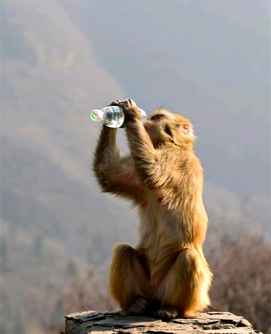 在沁阳市神农山风景区,一只野生太行猕猴捧着水瓶喝水。