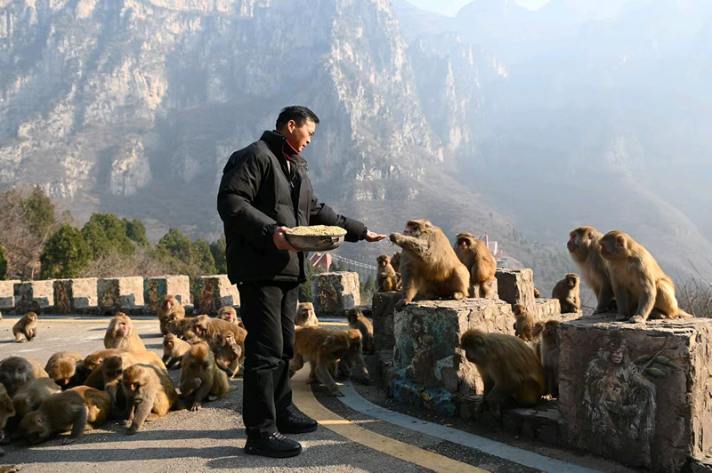 在沁阳市神农山风景区,饲养员给野生太行猕猴喂食。