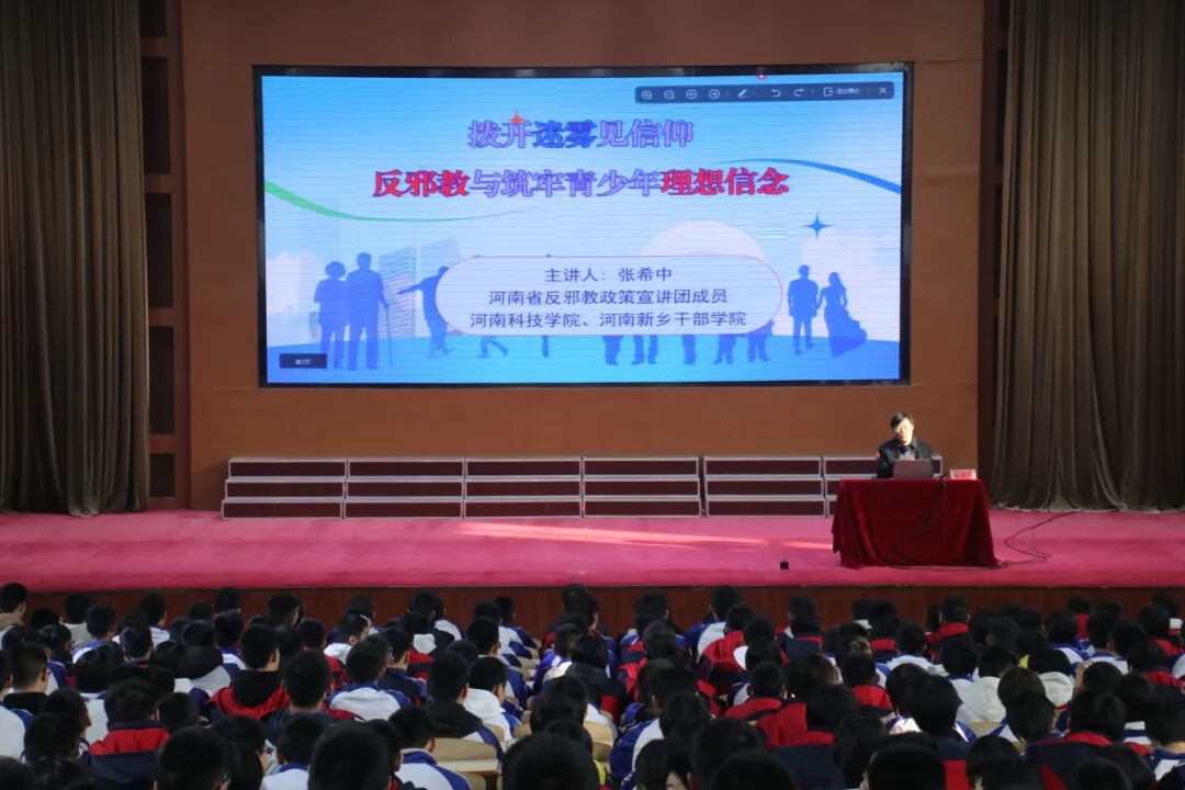 河南科技学院马克思主义学院副院长、副教授,硕士生导师张希中为全体师生带来《拨开迷雾见信仰,反邪教与筑牢青少年理想信念》主题宣讲。