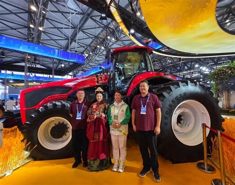 抖音达人“伊人若菱”(左二)在展馆里与高大的拖拉机合影。陈曼 摄