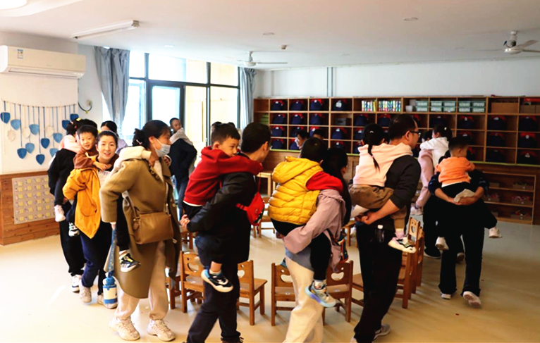 在中四班教室,“猪八戒背媳妇”的游戏现场将活动推向高潮。充满了诙谐与宠爱,家长们健步如飞,背上的“小媳妇”乐开了花;而中五班的“小脚踩大脚”,每一步都踏着满满的依赖与守护,场面温馨动人。