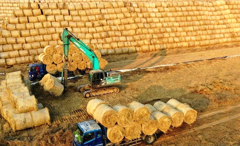 在镇平县马庄乡正强农机农业农民专业合作社的收储点,装载着打捆秸秆的运输车辆不时驶来,一捆捆秸秆被工作人员有序吊运至指定区域,整齐堆成。