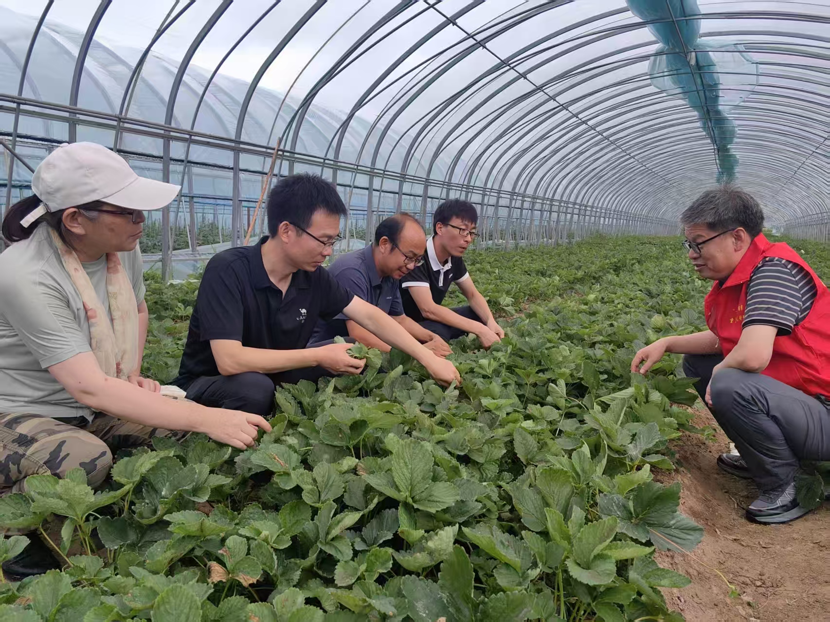 另一边,周厚成蹲在草莓大棚里,用树枝在地上比画着:“大棚育苗,可以避雨防病害,减少用药量降低生产成本。”他仔细观察着草莓植株:“以前露天育苗,一场雨就可能招来炭疽病,现在大棚里湿度可控,打药次数都少了好几回。”旁边的农妇张婶插话说:“俺算过,大棚里干活不晒不淋,一天还能多扦插两百株苗呢!”
