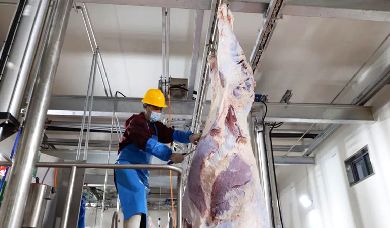 8月12日,在沁阳市西向镇的清河村和北鲁村交界处,一座现代化的肉牛屠宰加工厂正隆隆运转。走进车间内,工人们身着统一工作服,动作熟练而专注,在各自的工位上处理着牛肉产品。