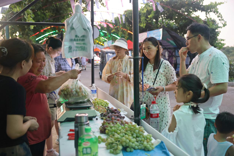张门会场开市当日,112个葡萄销售摊位、40家美食摊位、10家非遗展示区、20家农特产品展位前人头攒动。游客们一边品尝着香甜多汁的葡萄,一边沉浸于凤泉当地的风土人情中。凤泉区葡萄种植面积超3000亩,涵盖富士、巨峰、夏黑、阳光玫瑰等众多品种。这些葡萄在果农精心照料与农技协技术支持下茁壮成长,颗颗饱满,入口甘甜,似在诉说着丰收的喜悦。