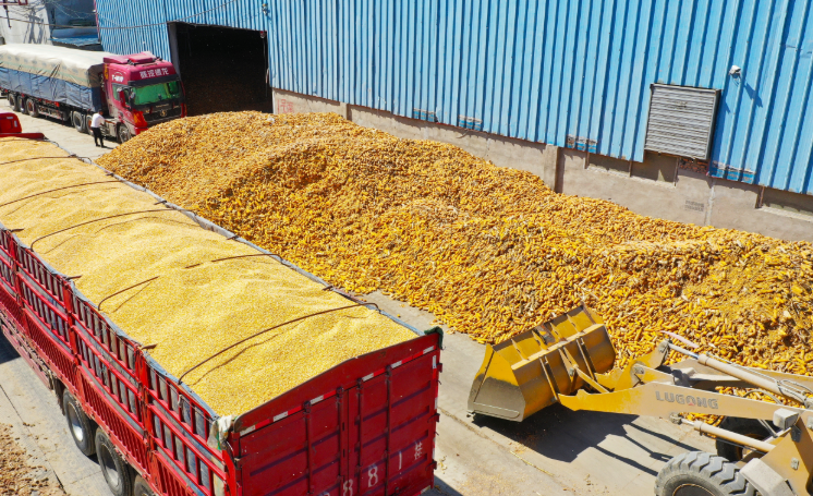 在位于建安区陈曹乡双庙村的许昌市郝东现代农业有限公司,工作人员在收储玉米(无人机照片)。许昌日报全媒体记者 牛书培 摄