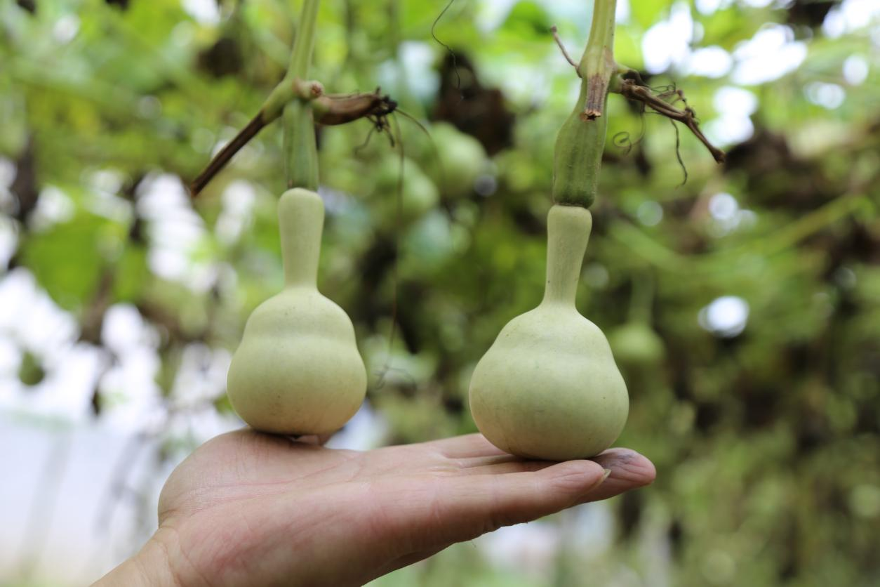 “去年是第一年种葫芦,种了一亩,收益不错。今年扩种,总共种了5亩。有八宝、莲花头、钱袋子等7个品种,目前看长势不错。”种植户杨波说。杨波是个不折不扣的“葫芦迷”,一天到晚都在葫芦园里转悠,哪个葫芦品相好,哪个葫芦需要加以“修整”,他心里一清二楚。