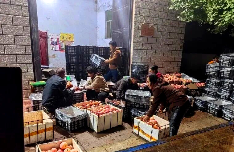 傍晚时分, 村里的苹果收购市场渐渐热闹起来,毛社雄拉着满车苹果赶到时,不少客商已在灯光下验货。暖光灯下,红富士泛着透亮的光泽,客商翻拣、称重、算账,毛社雄在一旁麻利地协助,不一会儿就完成了整车交易。如今,“白天摘果保新鲜、晚上售果快流通”的模式,已成为苏村当地果农的共识。