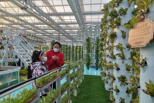 姚村镇下里街村现代化农业无土栽培科技研学科普基地工作人员在向游客介绍无土栽培生菜