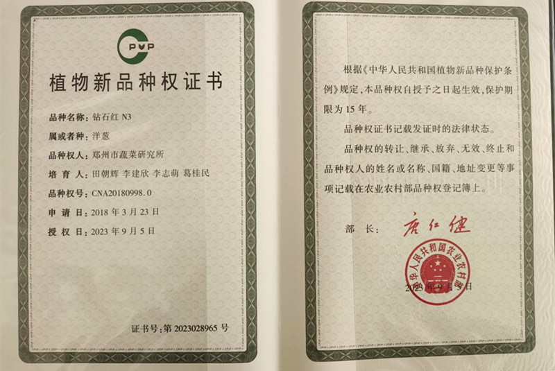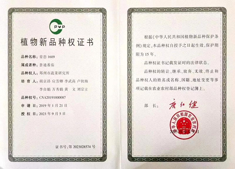 2023年9月5日,国家大宗蔬菜产业技术体系郑州综合试验站团队番茄新品种“青恋5914”、“青恋124”、“青恋1609”,洋葱新品种“钻石红N3”,4个蔬菜新品种喜获农业农村部植物新品种保护权证书。据了解,番茄课题组成立较早,已相继育成了“豫番茄一号”、“豫番茄六号”“金粉早冠”、“郑番06-10”、“越夏红”、“郑番1037”,“郑番1203”、“郑番1305”、“郑番12158”和“青恋521”新优番茄品种。其中,“豫番茄一号”、“豫番茄六号”是国内率先选育出的番茄抗烟草花叶病毒和耐黄瓜花叶病毒病的蔬菜品种;“青恋521”更是成为了口感番茄的排头兵。葱类育种课题虽然成立较晚,但是郑州市农业科技研究院副院长、国家大宗蔬菜产业技术体系郑州综合试验站站长田朝辉,带领团队成员针对洋葱育种“卡脖子”技术进行攻关,利用单倍体育种、诱变育种等生物技术资源筛选、创新种质资源,已选育出洋葱优良新品种2个。