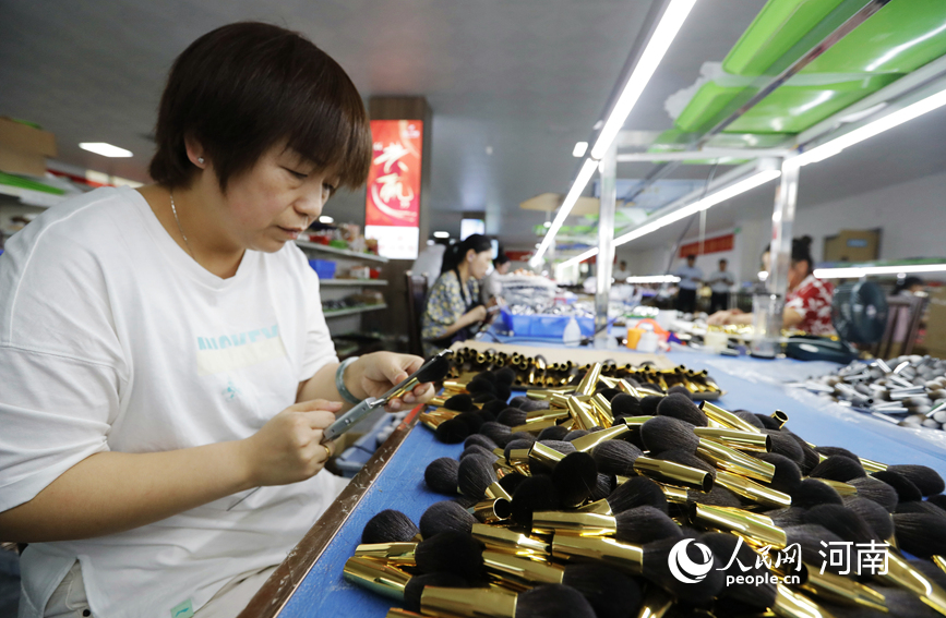 周口鹿邑县群众在生产车间制作化妆刷 人民网霍亚平 摄